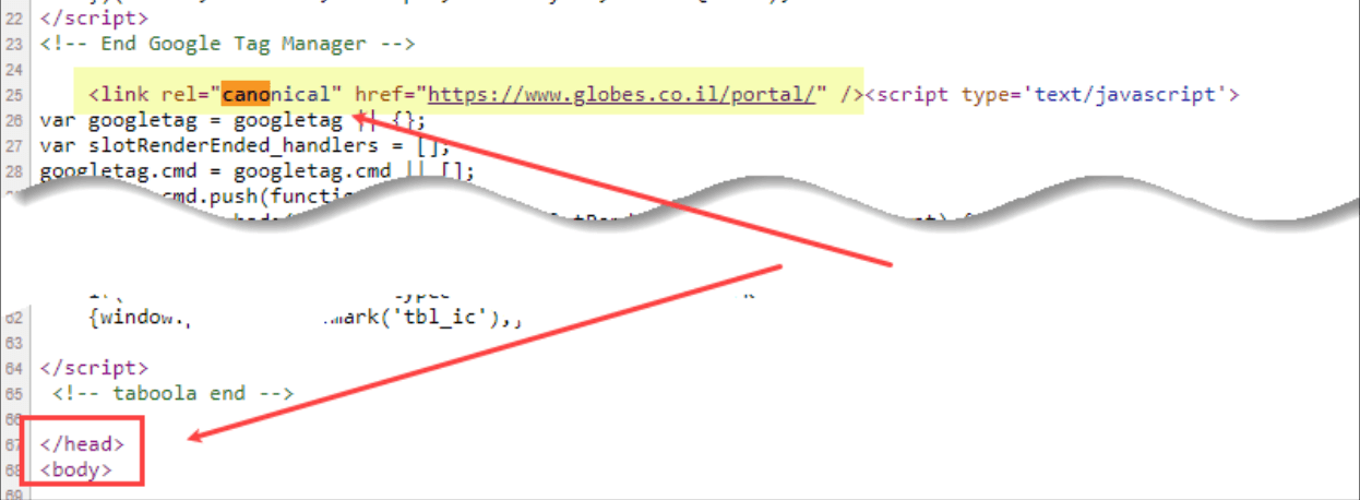 We blocked the JavaScript file https://www.globes.co.il/static/cache/js/header.js?ver=1@4b24 and confirmed that the canonical tag no longer moved to the <body> section.