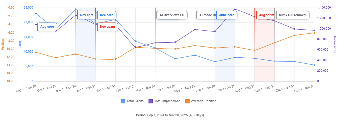 The real shift started when AI Overviews began to appear at the top of our target queries in mid-2024. First they showed up only in the U.S., then Google expanded them to more countries through late 2024 and into 2025. Each time AI Overviews started showing for more of our core queries, we saw another drop in clicks – even as our average position stayed around #1.
