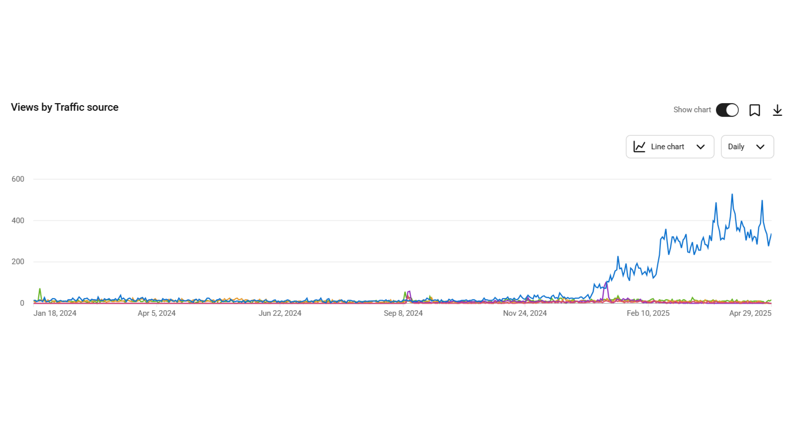 Looking at the traffic data, there’s a sharp uptick around January 2025. Google referrals spiked while YouTube Search and other sources stayed flat.